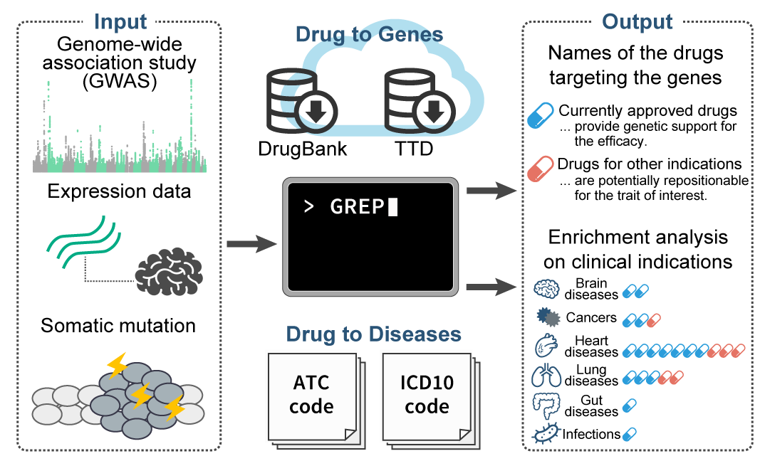 GREP can quantify an enrichment of the user-defined set of genes in the target of clinical indication categories and capture potentially repositionable drugs targeting the gene set.